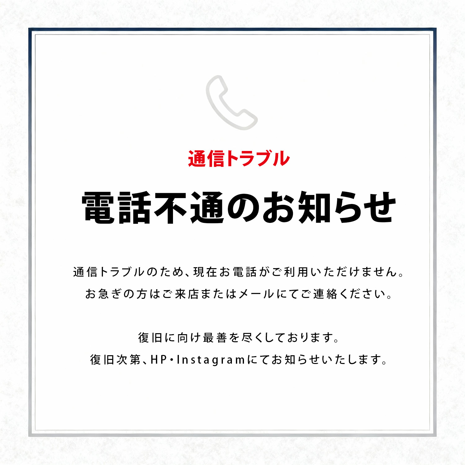 昨日より店舗の通信トラブルにより、現在お電話がご利用いただけない状況となっております。